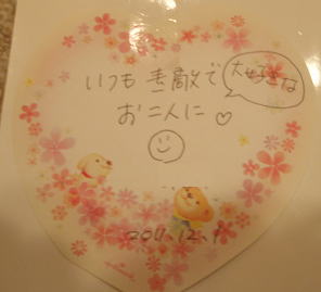 確実に身につけていただきたいので、少人数制で行う予定です。気になる方は、お早めにお申込ください☆ シンプルながらに練習や、どのような心で行うかの意識も大事な技術でもありますので、 過去に受けて、また練習したい方の再受講(半額に割引させていただきます!)もお待ちしております!ご予約・問合せ ※以前 開催した際の模様☆ 技術を学ぶグループワークじゃなくって、ご自分のテーマを、マンツーマンでじっくりカウンセリングして欲しい!という方は、 個人セッション(キネシオロジー)の方をご利用くださいね。ご予約・問合せ 2011年12月18日(日)律動の月6日 KIN 99 青い銀河の嵐 満登香です☆オーラソーマ個人セッションに来て下さった、お客様Mさんからいただきました☆ ディズニシーに行って来られたそうです♪クリスマスパレードがきっと、素敵でしたね^^ いつもアーティスティックな粋な雰囲気のMさん、お土産ありがとうございました♪ ![]() 12月14日の現代レイキ交流会には、7名の方が参加して下さいました。と~~~ってもイイ時間でした。 発霊法をしたり、レイキサークルをしたり、世界平和を祈ったり・・・レイキが心にもカラダにも空間にも染み渡って 身も心も癒されて幸せいっぱい☆ 本当に素晴らしい時間となりました☆ レイキ交流会の後は、行き着けのレストラン『こんこんぶる』に、ご参加の皆様と一緒にお出かけし 『こんこんぶるぶる忘年会』と称した女子会を急きょ開催しました♪ みんなでランチ(この日の日替わりランチはちなみに、白身魚のフライ&ハンバーグの盛り合わせ!おかず2種でボリューム満点(笑)) &ケーキまで頼み、ウッ苦しいッと言いながら、沢山食べて、沢山笑って、ときにホロリと涙して、みんなで、色んな話をしました。 今年も年間を通して、レイキを習得した生徒さん方から、本当にたくさんの印象的なフィードバックをいただきました。 不眠症が改善した、考え方がプラス思考になってきた、鬱病がゆるやかに回復してきた、 不安が減り生きるのがラクになった、出会う人たちが優しい人が多くなった、 出会う人たちが魂のご縁と言えるような人が多くなった、 従来の人間関係が良いものに変化してきた、生きてるのが楽しくなった・・・などなど・・・ 『これまで抗鬱剤と睡眠薬を、15錠飲んでもなかなか寝付けなかったけれど、レイキL3まで受けてから、眠くて眠くて仕方なくて、これなら薬を減らしても眠れるかもと思って、5錠に減らしてみたんです。そうしたら、すぐに眠れたんです。薬の量がこんなに急に減って驚いています、ありがとうございます(TT)』と、こっそり報告してきてくださった生徒さんもいらっしゃいました。。。(本フィードバックは、ご掲載のお許しをいただいてご紹介させていただいています。) こうしたフィードバックをいただく時、私の胸も、きゅーん(TT)としています。 その方のこれまでの辛さや、大変さを想像し、胸が痛むと同時に、それがレイキによって少しでも良くなったと言うお話を伺うと、 なんとも言えない、宇宙への深い感謝の気持ちに包まれます。そしてこれからもますます、最善のことがその方に起こりますよう祈ります。 2012年から新たにレイキを習得し、ハンドヒーリングで自分やご家族・ご友人・クライアントさんを癒しながら精神性向上を目指したい方、こちらをご覧下さい。⇒現代レイキ協会認定スクール 再受講無料制度など、アフターフォローも万全です!受講生のCさんが、ご自身のブログにPOFのレイキ講座アフターフォローの素晴らしさをご紹介下さいました。(Cさんありがとうございます!) また日程リクエストをいただきまして 1Dayの入門講座ですが、自分や他者の体の声が聞けるようになりとても便利な講座です。