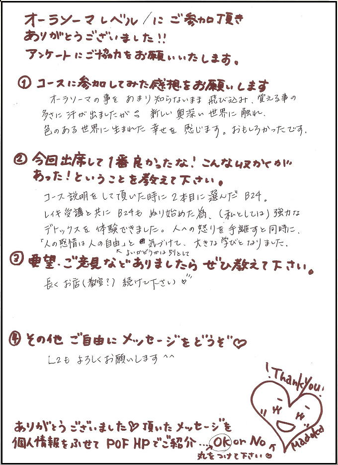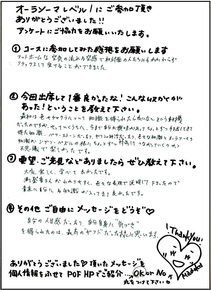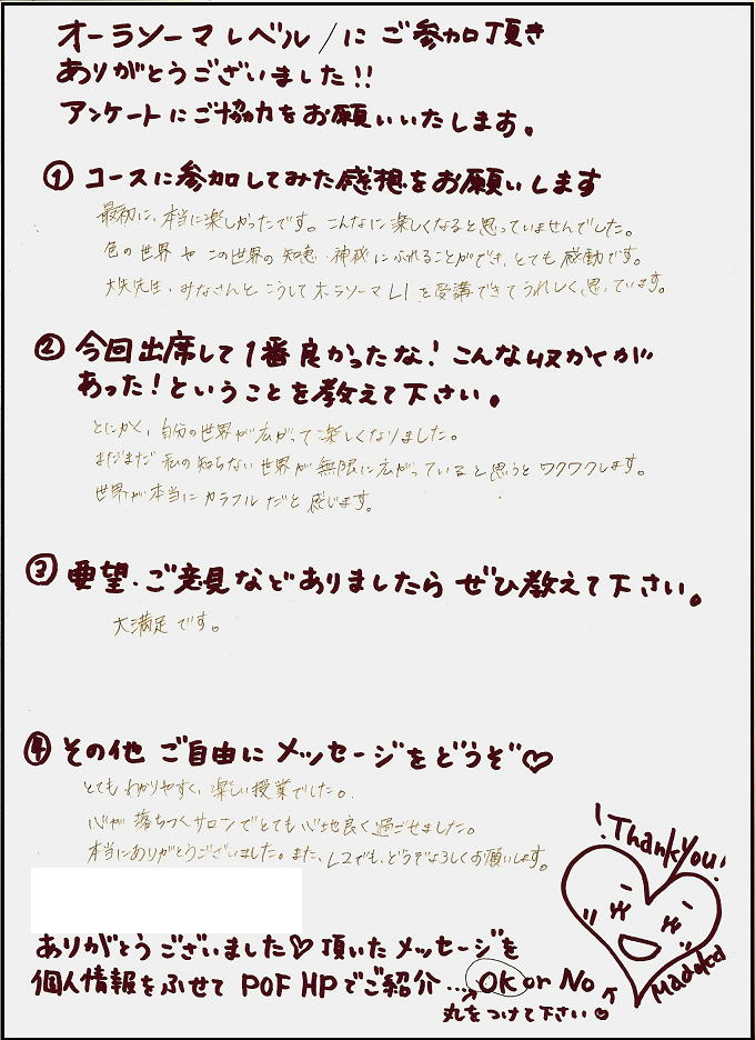 2012年5月12日(土) 満登香です英国オーラソーマ社認定スクールL1のご感想をいただきましたので、ご紹介します♪ ☆満登香よりコメント☆ 『自分の人生感だったり自分自身に“気付き”が得られたのは、最高の“ギフト”だった様に思います。』 というコメントを拝見し、私も心から嬉しく思います。 オーラソーマを通じて、手にしていただけるものはその“気付き”なんですよね♪ 優しく思いやり深いピンクやヴァイオレットの色が輝いていたYさん♪ありがとうございました♪ ☆満登香よりコメント☆ 『本当に楽しかったです。こんなに楽しくなるとは思いませんでした』 『世界が本当にカラフルだと感じます』 Mさんが体験された、感動が本当に、のびやかに伝わって来るコメント、ありがとうございます♪ オーラソーマは、本当に人生に新しいワクワクの扉を開いてくれますよね。 その感動を共有できて私も本当に光栄です! ☆満登香よりコメント☆ コースご参加前に、ボトルを使って、深い気付きがあったYさん。 内側の世界を深く探求されるYさんだったからこその、深い気付きでもあったと思います。 こうした気付きを、誰かから言われて気が付くのではなく 内側からストンと、ふに落として気が付いていくことを助けてくれるのがオーラソーマのスゴイところ! オーラソーマの真髄を受け取って下さったYさんに、拍手と感謝を贈ります^^ 『色のある世界に生まれた幸せを感じます』 このコメントが、心に響きます。ありがとうございます!