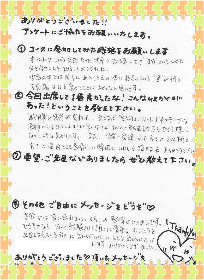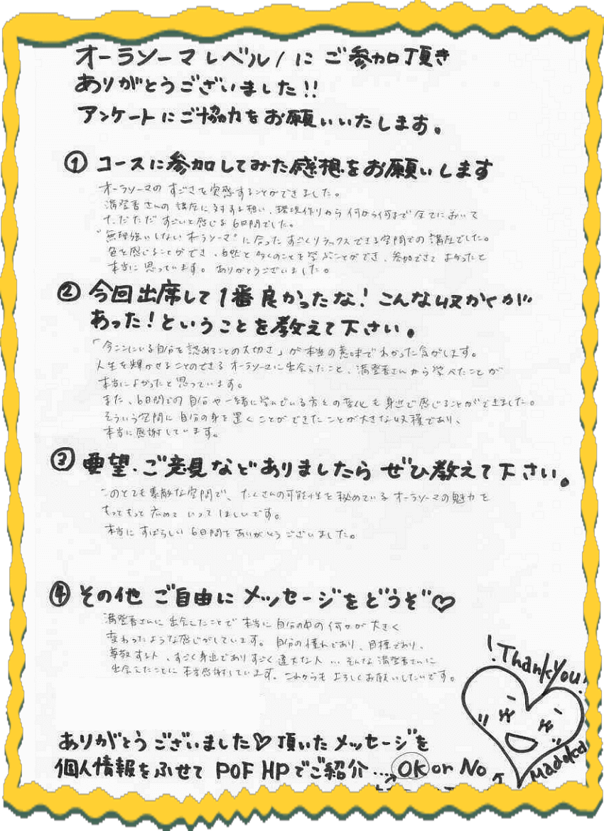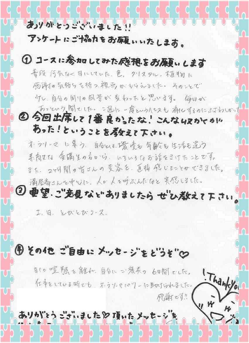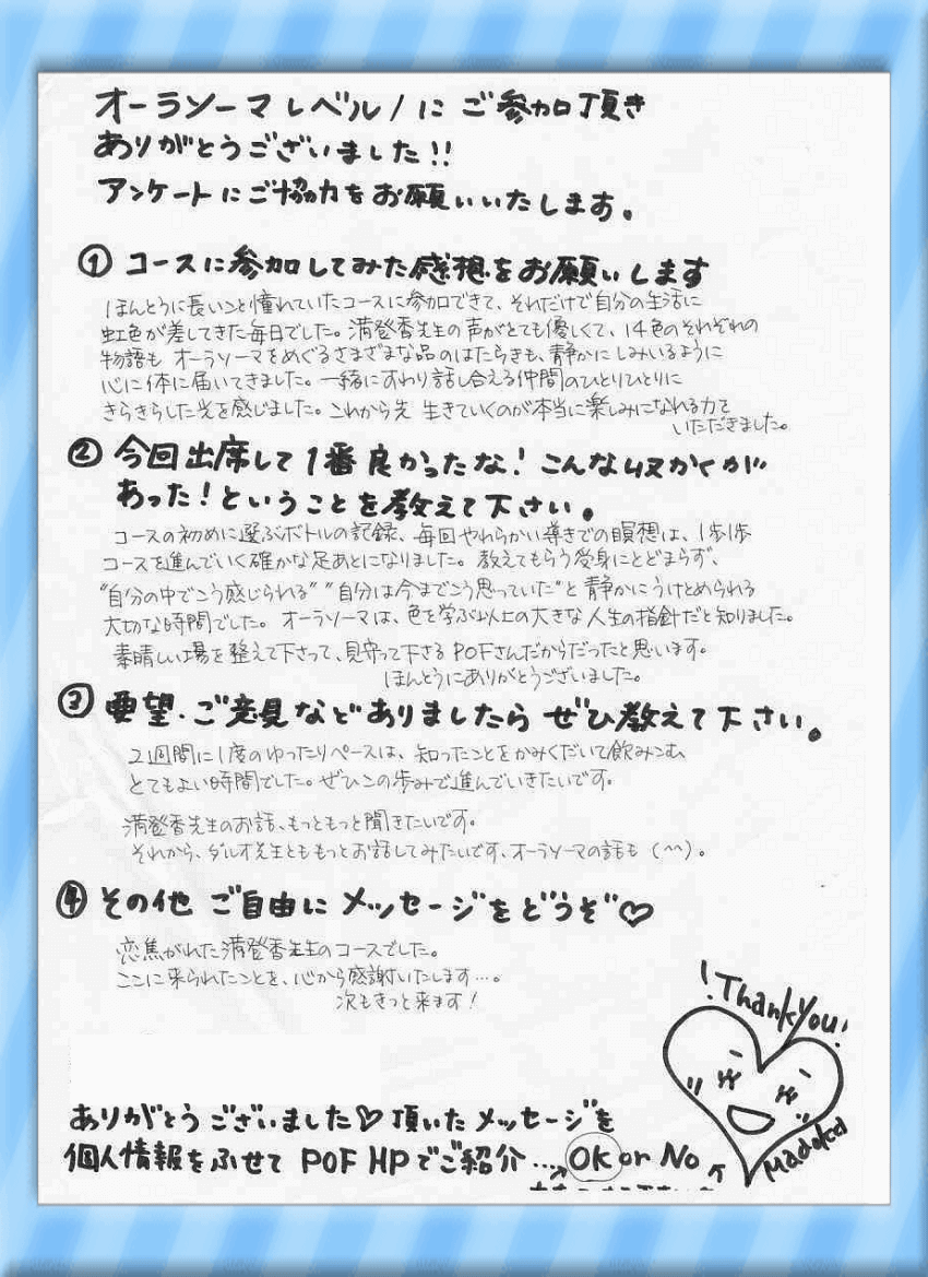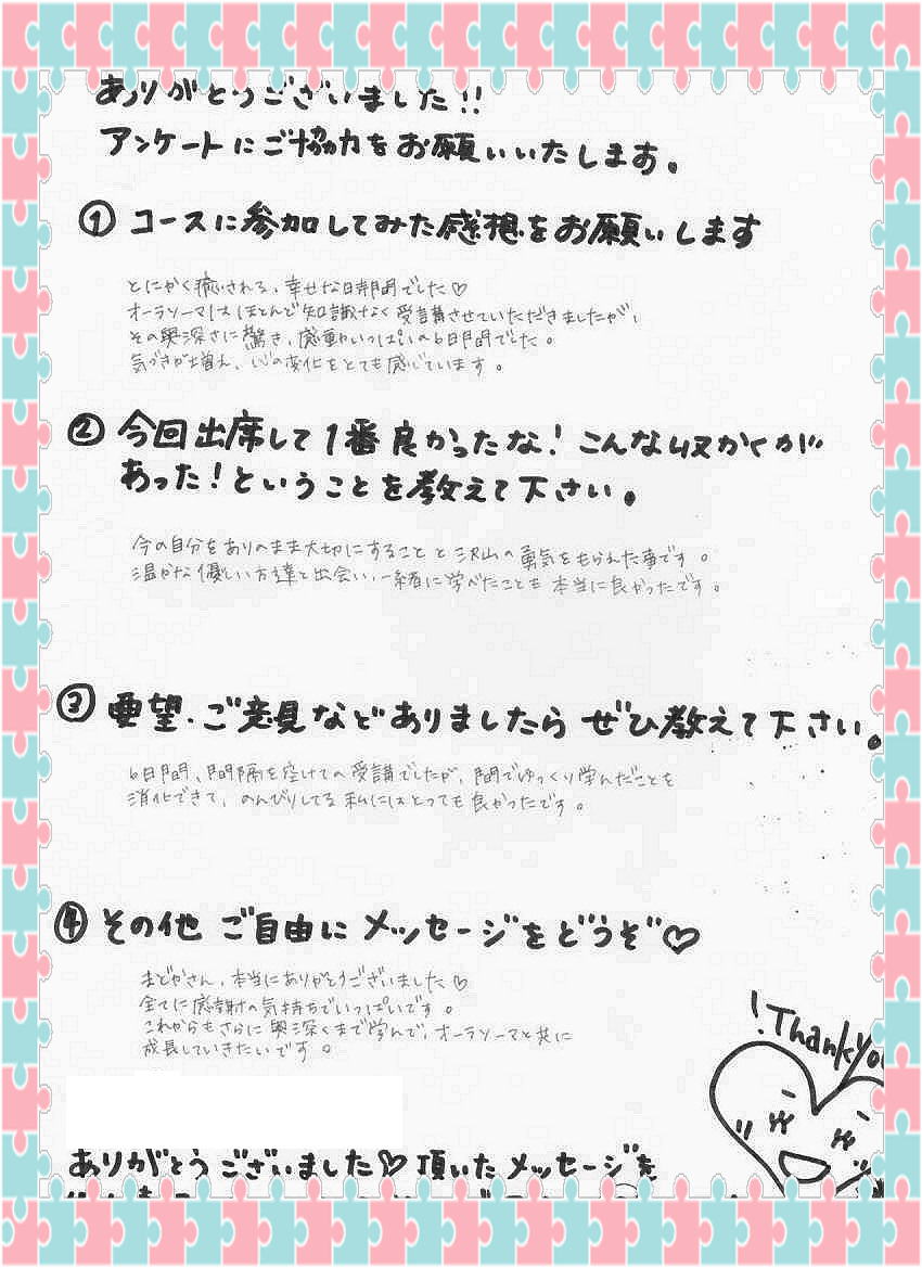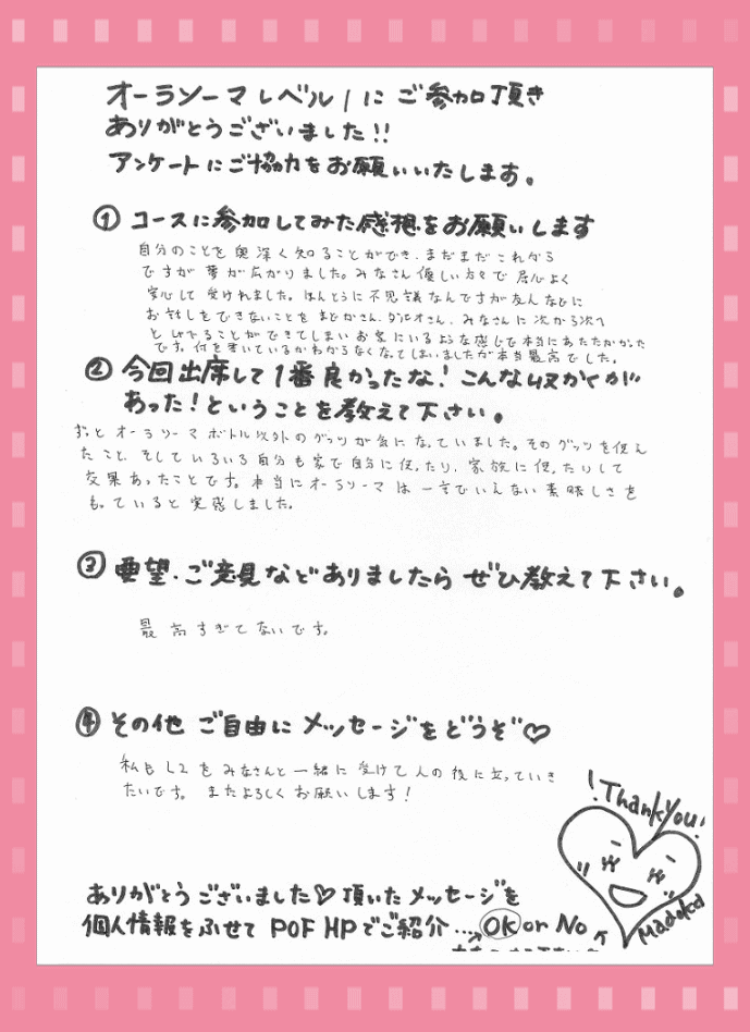 新規生は、両日とも出られる方 再受講生は、片方でも可能 (要前日までの予約) 詳細はこちら・現代レイキ協会認定スクール ご予約・問合せ ◆どなたでも参加可能 講座◆ 2013年5月13(月)-2 先日の数秘術プロ養成ワークショップのご感想を ひなちゆさんがブログに書いて下さいました。(ありがとうございます~^^) POFのオーラソーマ(R)プロ養成コースL3卒業生のひなちゆさん。 現在、オーラソーマの定期コンサルテーションのモニターを募集しています。 ひなちゆさんのコンサルが、なんと無料で6回も受けれるのです… すごい企画です。 私から見ていて、ひなちゆさんはコンサルテーション中、 とても安定感があります。 ハートが温かいです。 モニターといえども、 正直、無料である必要はないレベルだと思いますが、 さらにレベルアップしたいという ひなちゆさんの本気具合が伺えます。 ご興味のある方はぜひ、ご自分を見つめる機会に受けて見て下さいネ。 無料だと申し訳ない~と思う方は、ぜひ、アンケートをいっぱい書いてあげて欲しいです。 こちらに書かれてるひなちゆさんの想いが素敵↓ぜひ読んでみてくださいませ☆ ひなちゆルーム☆オーラソーマの定期コンサルテーションのモニター ◆どなたでも参加可能 講座◆ 2013年5月13(月)-1 満登香(まどか)です。3月から2か月かけて計6回開催して来た オーラソーマ(R)プロ養成コースL1 昨日、無事全日程が終了しました。 ご参加頂いた、皆さま、ありがとうございました。 最終日、皆さまからおやつを沢山頂きました。。。 お花まで。。。ありがとうございます。。。(感涙) アンケート…サイズ的に、スマホなどでご覧の方は見辛いかもしれませんが、 嬉しかったので載せてしまいます。。。 皆さんがお帰りになった後、アンケートを見て1人サロンでうるうるしておりました。 本当、ティーチャー冥利につきます! 皆さんにオーラソーマをナビゲートさせていただくことが出来て 私も本当に光栄でした☆ レベル2でお目にかかれるのを楽しみにしています!