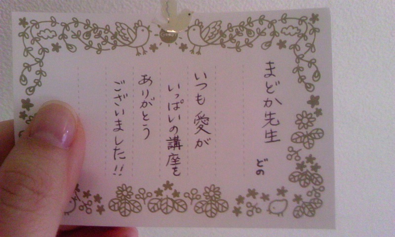 昨日、今日と、アロマ・カフェキネシ インストラクター養成講座でした。 この講座、2時間でインスタラクター資格まで取れてしまうという講座なのですが 起こる癒しはなかなか本格的なもので、参加者の皆様から、沢山のご反響を頂きました。 ![]() 今日の講座中、私は参加者のAさんと組ませて頂いていたのですが となりで参加者のBさんと講師であるダルオが、ペアになっていました。 このカフェキネシでは、乱れた経絡に対応した、『質問』というものがあるのですが Bさんが、そのマニュアルに従って 『貴女がなくしたものは何ですか?』とダルオに質問した所、ダルオの口から 『なくしたものは、軽い心です。』という、ファンキーな答えがっっッ…!^^; 『ええ?!!』と その返答のディープさに思わず隣の席から反応してしまいました。。。 Bさんも、それに対して ええ!!?^^;と おののきながらも、 上手に対応してくださっていました。 (初めてなのに素晴らしい対応力です!) でも、私はダルオのその答えがツボにハマッて しばらく笑いが止まりませんでした。。。(※すみません。。。) Bさんのセラピーによって、結果、ダルオは癒されたようです(笑) アロマ・カフェキネシ インストラクター養成講座 最初は練習が必要ですが、ひとたび慣れると簡単です。 学ぶスキルは極めてシンプルです。 受講をご希望の方は7月、8月も開催が可能ですので、 ご希望日程をいくつかお知らせ下さい。ご予約・問合せ 再受講も可能です!(再受講生/5000円) 2013年6月1(土)-1