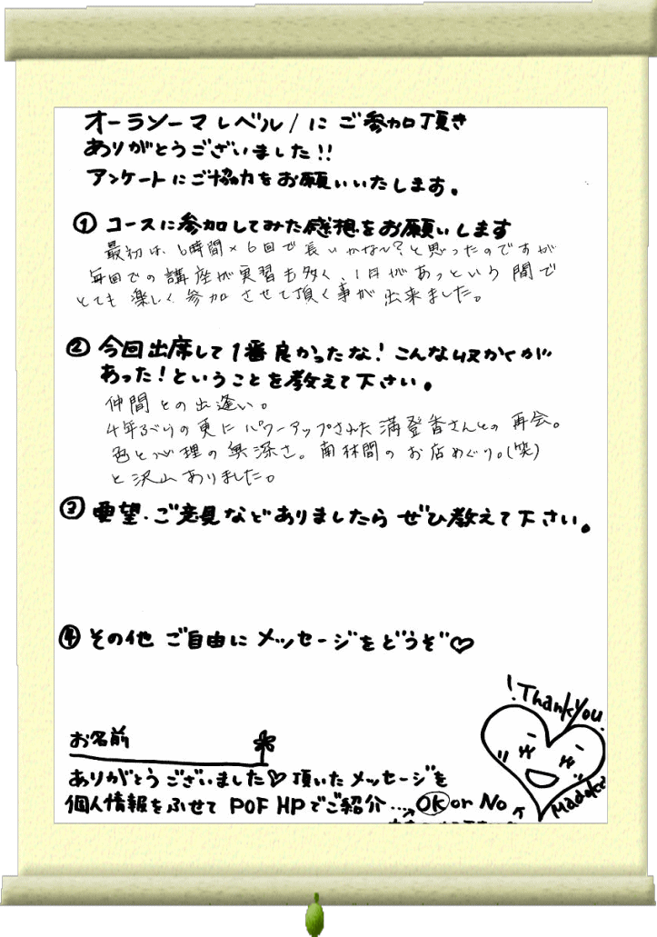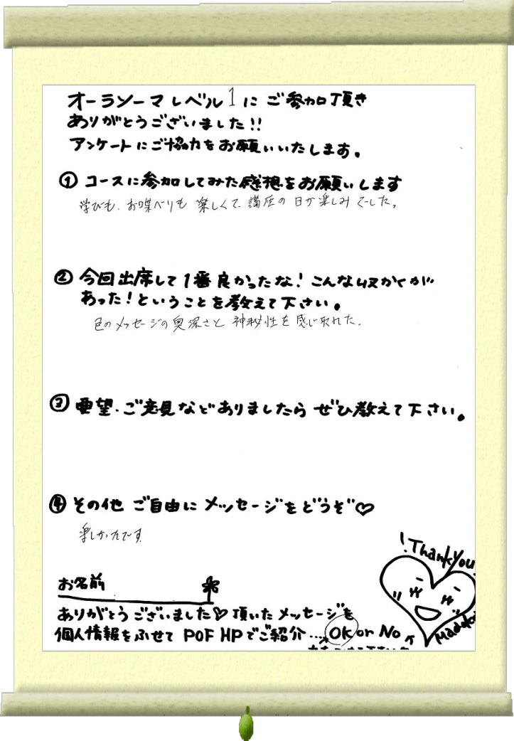あなたの人生そのものを軽やかにするヒーリングスクールです。 HPをご覧いただきありがとうございます! POFは、あなたの心を癒し、温め、軽やか~♪に 生きていくことをお手伝いする ヒーリングスクール&サロン★ 地に足をつけた☆バランスの良いスピリチュアル! 質問しやすく親しみやすい、楽しい雰囲気のサロンで 沢山の社会人・主婦・学生の方々が セラピーや講座をご利用下さっています☆ |