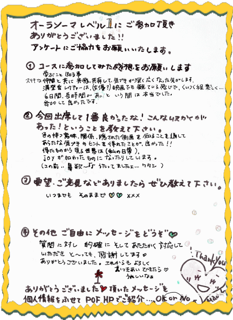 ラハシャ博士のコースでは良く食べ、良く笑い、良く学びました。。。 ![]() ![]() 優しい通訳の伊藤アジータさんと☆ヴィッキーさんの自伝の翻訳を担当された、あの方です。 ![]() ヴィッキーさんの愛と真摯な情熱にあふれた この本は、今でも私のバイブルです。 ![]() ボランティアで被災地支援をされている方に、 オーラソーマ社からの寄付プロダクツや被災地 支援を行っている慈善団体の冊子などをお渡ししたら、 お礼にと、可愛い手作りストラップを頂きました。 いえいえ、お礼なんて・・・と思いましたが、 優しいお心、有難く頂戴いたしました。 ![]() かけがえの無い時間を共に過ごした仲間と☆ 私、顔欠けてますけど・・・(笑)かえって楽しさ はじける様子が伝わるでしょうか。 ハートから繋がった優しい仲間たちと本当に深い学びの 時間を頂きました。皆の愛に、ただ、感謝です☆ ![]() ラハシャ博士からご教授頂いたカウンセリング技法のシェアでもあります、 に早速、沢山のお申込みを頂きありがとうございます。 このセッション、お勧めしたい方が沢山います。 なぜなら、人生で苦しみを生み出すのは、いつも大抵、 誰かとの関係性だからです。 関係性が牢獄ではなく、天国であるには、何を発見すればいいのか? 貴方の中に、答えはちゃんとあります。それを見つけるセッション。 このセッションでは、関係性を見つめたい相手をお1人にしぼって頂き、 その方との関係をテーマに行っていきます。 なので予め、この人との関係性をテーマにしたいと思う方を決めて来て頂ければと思います。 ※あまり頭で考えず、直感で決めるのが良いかもしれません。 2014年4月26日(土)-1