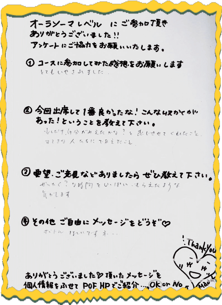 あなたの人生そのものを軽やかにするヒーリングスクールです。 HPをご覧いただきありがとうございます! POFは、あなたの心を癒し、温め、軽やか~♪に 生きていくことをお手伝いする ヒーリングスクール&サロン★ 地に足をつけた☆バランスの良いスピリチュアル! 質問しやすく親しみやすい、楽しい雰囲気のサロンで 沢山の社会人・主婦・学生の方々が セラピーや講座をご利用下さっています☆ |