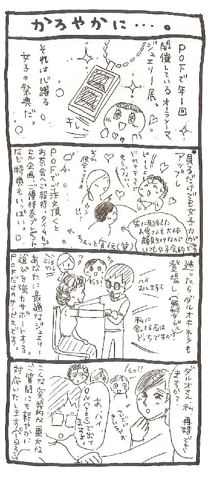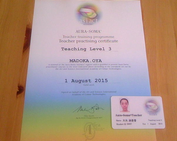 旦那様やお友達とのご参加、歓迎です♪一緒に選んだりするのも楽しいですよね。旦那様やお友達も コンサルテーションを受ける場合は、連続して2枠ご予約してください。 皆さまのもとへ、たくさんのギフトが訪れますように・・・☆(*^^*) POFだけのオリジナル・サービス 当店は、プロのキネシオロジスト オオヤダルオによる、身に着けると良い石・素材・形のセレクション・サポートも 行っています。(ご希望者のみ/この日だけの特別無料サービスです) ご予算に合わせて、最適な石を選べるとご好評です。 ※これがまた、凄い、キネシで選ぶと変化が早いと、ご好評いただいております! ![]() 実際に持った方のご感想 2010年3月開催時にオーダーされたS様(女性 30代 アパレル)より。 ☆体験談☆ 22番(再誕生ボトル)で作ったネックレスに想いを込めて毎日身につけています。もうすぐ2カ月が 経つのですが、 この短い期間で様々な事が起こりました。身につけてすぐ職場の後輩達に変化が起こった事が私のスタートでした。 特に頭を抱えていた男性スタッフが翌日生まれ変わったかのような変貌ぶりで出勤してきたんです。体裁と言葉だけで 自分を繕う仕事ぶりにイライラしてたのですが突然、素直で真っ直ぐな頑張り屋さんに大変身しました。 オマケに私の大好きな天然ボーイに化けてしまいその子のおかげでお店の雰囲気が良くなり理想 のお店作り(環境)が順調に進んでいます。 また、ネガティブ思考で人に合わせてばかりの友人が一人旅に行き自分で自由に選択出来る喜びを味わい生まれ変わって帰ってきました。 その子を知る私にとってはこれも奇跡が起きた!!と思う出来事でした。このような周りの人達の変化を見る事から始まり何かを学んでる 感覚が沸き上がりました。 次に起こった事は自分が楽しむ時間が増えた事です。その手始めがホットヨガを通い始めた事がきっかけとなりました。 体と心が離れて いた事に気付きそして体を動かす喜びを思い出しました。その事で時間の使い方 が格段に変わり 自分が喜ぶ事で時間を満たしたくなりました。 そして最近はもっと楽に自由になって良いはず と強く思うようになりました。今までは苦労や我慢 を乗り越えなければ願いは手に入らない と思ってましたが 別の選択肢もあるんじゃないかと思い初めてます。 そうなると応援してくれるかのようにヒントになる出来事や本などのご縁が増えてきました。根強い固定観念 なので混乱もありますが 心の感じるまま今に身を置いてます。 再誕生の22番には自由で楽しい人生を思い描たのですが驚く程のサポートの数々に私の為 に作られたジュエリーだと改めて確信と感謝を持っています。 皆がなりたい私になってキラキラ輝き出し、心の疑問が強く浮き彫りになったり。。。私は生まれ変わる、もしくは元の私に戻るスタートを 切ったんだなぁと改めて感じ てます。オーラソーマとまどかさんに出会えて本当に良かったです。 ありがとうございました。 満登香よりコメント/Sさん、私にまでもったいないくらいのお言葉をいただきありがとうございます。Sさんの人生はその後も、 どんどん22番のように再誕生を遂げていますね。Sさんの素晴らしい旅路。私もいつも影ながら応援しています。 今日は日々、寄せられるご質問に、お答えしたいと思います。 最後に… 長い記事でしたね。(途中、変な漫画もありましたね。。。) ご覧くださった皆様、ありがとうございます。 最後に箸休め… オーラソーマジュエリーと関係ありませんが(笑) ダルオと阿部先生のお宝映像をご覧ください。 ミカン箱に入れられるダルオさん この後、川に捨てられるのか?ミャー!! 宇宙人が宇宙人を着てると話題になった1枚。 何を思ったか、お寿司屋さんで、インディアンのモノマネ (By爪楊枝ケース)をし出す、巨匠阿部小百合先生。 ![]() そのままお箸にエビのしっぽを装着して、天使の矢!! ![]() ズキューン!!と生徒さんたちのハートを狙い撃ち!! ![]() ![]() ダルオさんも爆笑していた、某コースの昼休みでした…♪ 優れたセラピストはどこにいても子供のように軽やかです^^ こんな、愉快なメンバーが、ご来場の皆様をお待ちしております♪ 2014年7月18日(金)-2 ASIACT JAPANから、今年のティーチャー免許の更新手続きが済み 免許が送られて来ました。このように、オーラソーマ(R)ティーチャーは 1年毎に、勉強して、免許を更新しています。 ![]() ティーチャー活動も、この夏で6年目です。 オーラソーマ(R)、大好きだから、ティーチャーになりました。だから、 この毎年更新も特に面倒ではなく、むしろ、誇りです。^^ もちろん、職業としてのティーチャーは、いつか、辞めたくなったら辞める のかもしれないけれど、(魂はいつでも自由です。)すでにオーラソーマ(R)は 私の一部な気がしていて、辞めるとか辞めないとかが、無い、そんな感じでもあります。 上手く言えないけれど、オーラソーマ(R)は人生の中で、大事な事を 教えてくれる賢者で