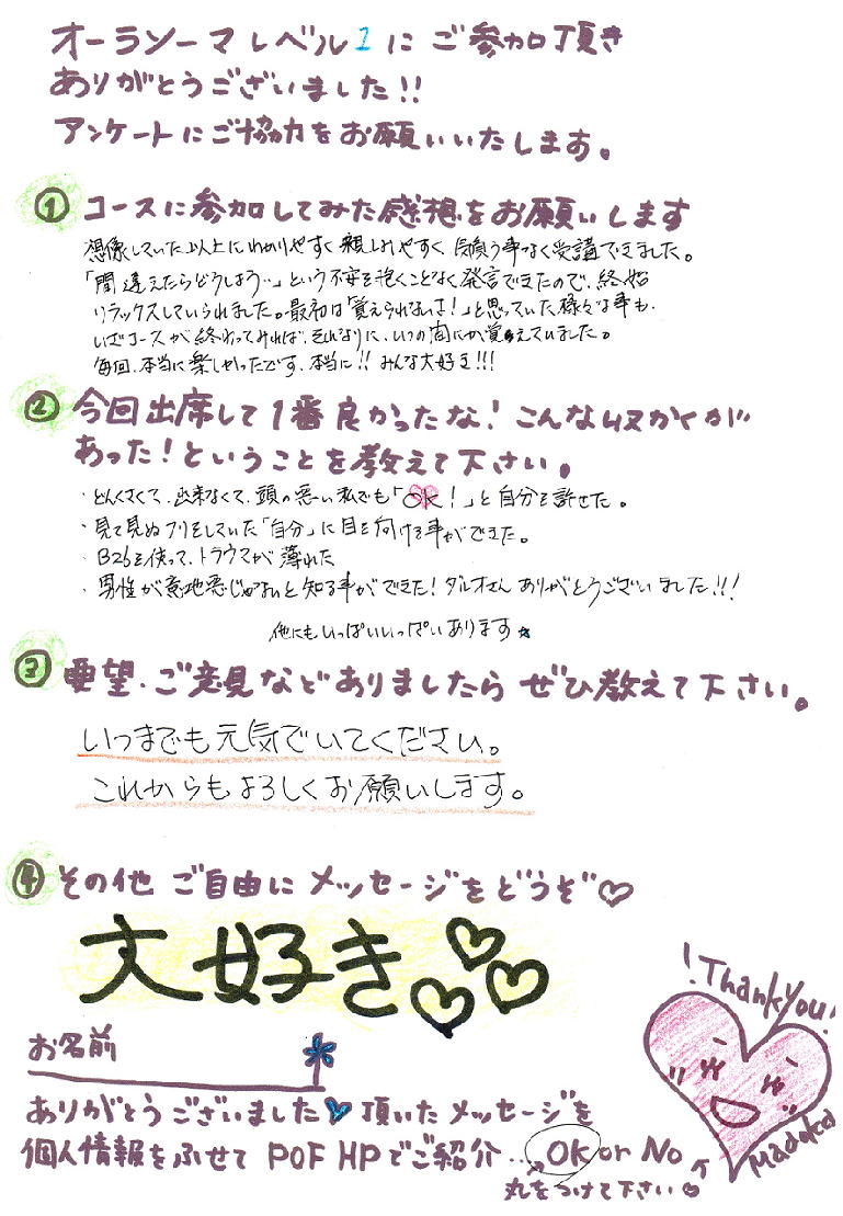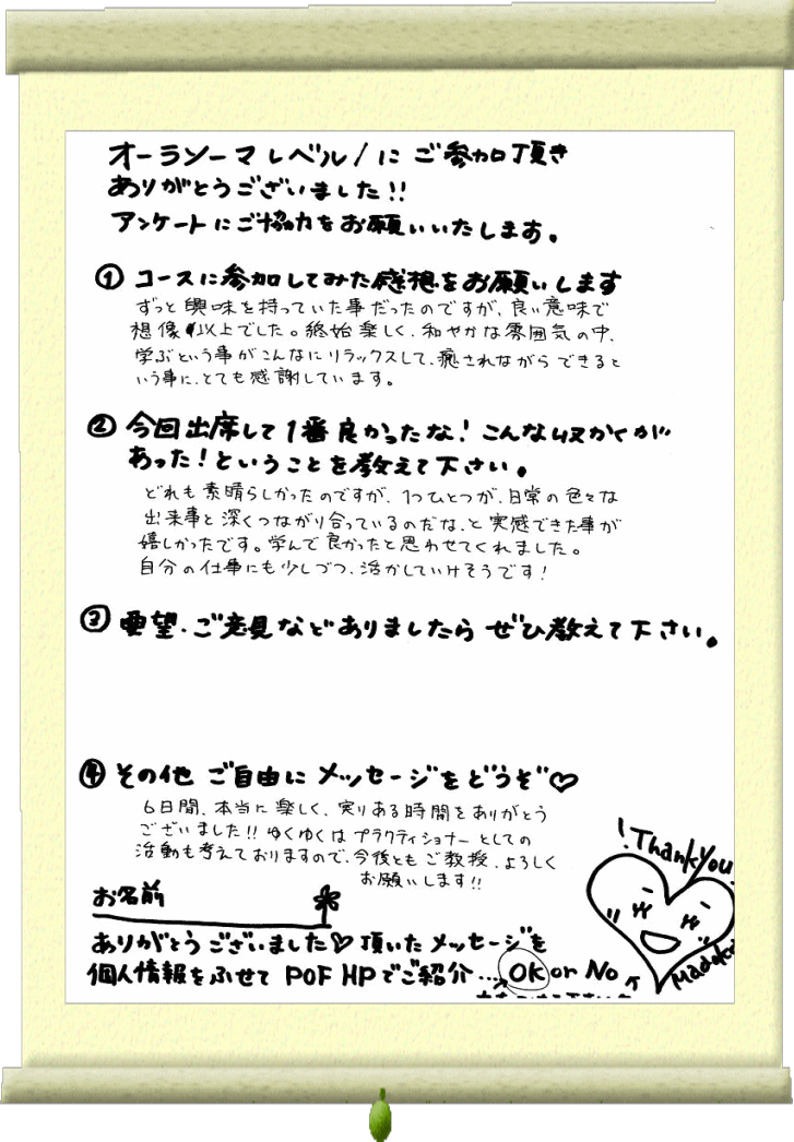 缶や、コンビニ、スタバの 紙カップのコーヒーは、カーペットの上では 簡単に倒れ、講座を中断する事が多いため、皆様のご協力をお願いしております。 サロン内ではいつでもお飲み頂ける、ヒーリング・ウォーターをご用意しております。 また、それに加え、個人セッション時には、1度のティーサービス、 講座時には、セルフのフリー・ドリンクサービスを設けております。 宜しければそちらもご利用下さい。 (Q5) 他のヒーリングサロンで、精神的な薬を飲んでいる方は、一律 利用出来ない所を見かけます。POFはどうですか? (A5) POFでは、薬の服用の有無『だけ』で、ご利用を制限したり、お客様を判断することはしておりません。 医療行為ではないという事と、ご利用は全てご本人様の自己責任という事をご理解頂ける場合 またその他、通常のご利用に差支えが無いと私共が判断させて頂いた場合、何の問題もなく 通常通りご利用いただけます。 POFの活動の8年の中で、のべ4000件を超えるクライアント様の中には服薬中の方も 数は少ないながらにいらっしゃいました。 そうした方たちが、病院と並行しながら、POFでの癒しの時間を上手に利用してくださり 薬が減る、無くても大丈夫になる 薬があってもなくても明るい気持ちで過ごせるようになるなど 結果として良い方向へ向かわれているのを拝見すると お断りせずに対応させて頂いて 本当によかったと、人として、有難く感じる事が多々あります。 (私たちもベストを尽くしますが、最終的にはお陰様の感覚で、おてんとうさまに手を合わせたくなります^^) そうそう、POFを満登香が、自宅サロンから、多大なるリスクの重圧に負けず、 路面店に移したのは、当時、自宅サロンに来て下さっていた鬱病のお客様方が、 数度のコンサルと数本のボトルで、みるみる良くなって行かれた事が大きなきっかけでした。 世の中にまだ知られていないけれど、医療行為ではないけれど、 民間のもので、けっこう役に立つもの、沢山ありますよ、というのを 広く、皆様にお伝えしたくて2008年9月に構えたのが、今の、南林間のPOFの駅前店舗です。 お元気な方も、今は薬とちょっと仲よくされている方も、どなたもみんな、地球の子☆ 楽しくPOFをご利用いただけたら嬉しく思います。いつもありがとうございます^^ 2015年3月土日!英国オーラソーマ社認定L1コース 2015年2月1(日)スタート占星術・数秘・古代叡智とオーラソーマのめくるめく6日間♪オーラソーマレベル2/今回のみ1日ずつの再受講OK! 素肌美輝く☆AEOSコスメティック1Day☆大々好評につき、祝追加講演!残席1 2015年1月22(木) ![]() 2月1日から始まる、オーラソーマレベル2 スポット再受講に、お問い合わせやお申込みを頂きありがとうございます。 ●初めてオーラソーマレベル2を受ける方 L1終了から3ヶ月以上経過した方がご参加頂きます☆ (その場合、6日全てご出席頂きます。) ![]() ●以前オーラソーマレベル2を受けたことがある方 下記の再受講料金にてご出席いただけます。 通常は6日通しのみの募集ですが、今回、特別に下記日程のみ 1日のみのスポット再受講もお受けいたします。 日 程 :2月1(日)4(水)7(土)8(日)11(祝水)15(日) 他校でL2を受講された方 13000円/1日 POFでL2を受講された方 7000円/1日 6日通しだと、お安くなります。 他校でL2を受講された方 65000円/6日 POFでL2を受講された方 35000円/6日 (※上記受講料は2015年1月現在のものです。) ●詳しいスケジュール