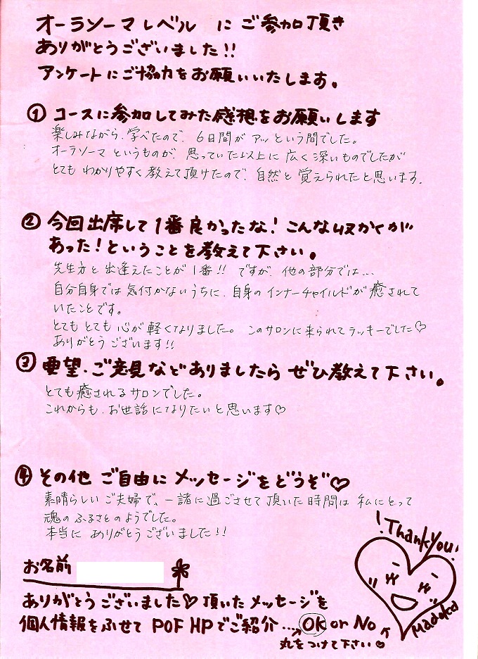 ♪貴方がもっと、貴方自身になるために♪ HPをご覧いただきありがとうございます! POFは、ジャッジの無い、ほっこり暖かな 総合ヒーリングスクール&サロンです。 モットーは『人はみんな違って、みんないい』 『地に足をつけた、バランスの良いスピリチュアル』 質問しやすく、楽しい雰囲気のサロンで沢山の社会人・ 主婦・学生の方々がご利用下さっています☆ |