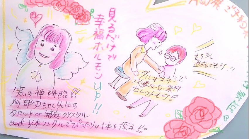 旦那様やお友達とのご参加、歓迎です♪一緒に選んだりするのも楽しいですよね。旦那様やお友達も コンサルテーションを受ける場合は、連続して2枠ご予約してください。 皆さまのもとへ、たくさんのギフトが訪れますように・・・☆(*^^*) POFだけのオリジナル・サービス 当店は、プロのキネシオロジスト オオヤダルオによる、身に着けると良い石・素材・形のセレクション・サポートも 行っています。(ご希望者のみ/この日だけの特別無料サービスです) ご予算に合わせて、最適な石を選べるとご好評です。 ※これがまた、凄い、キネシで選ぶと変化が早いと、ご好評いただいております! ![]() 実際に持った方のご感想 2010年3月開催時にオーダーされたS様(女性 30代 アパレル)より。 ☆体験談☆ 22番(再誕生ボトル)で作ったネックレスに想いを込めて毎日身につけています。もうすぐ2カ月が 経つのですが、 この短い期間で様々な事が起こりました。身につけてすぐ職場の後輩達に変化が起こった事が私のスタートでした。 特に頭を抱えていた男性スタッフが翌日生まれ変わったかのような変貌ぶりで出勤してきたんです。体裁と言葉だけで 自分を繕う仕事ぶりにイライラしてたのですが突然、素直で真っ直ぐな頑張り屋さんに大変身しました。 オマケに私の大好きな天然ボーイに化けてしまいその子のおかげでお店の雰囲気が良くなり理想 のお店作り(環境)が順調に進んでいます。 また、ネガティブ思考で人に合わせてばかりの友人が一人旅に行き自分で自由に選択出来る喜びを味わい生まれ変わって帰ってきました。 その子を知る私にとってはこれも奇跡が起きた!!と思う出来事でした。このような周りの人達の変化を見る事から始まり何かを学んでる 感覚が沸き上がりました。 次に起こった事は自分が楽しむ時間が増えた事です。その手始めがホットヨガを通い始めた事がきっかけとなりました。 体と心が離れて いた事に気付きそして体を動かす喜びを思い出しました。その事で時間の使い方 が格段に変わり 自分が喜ぶ事で時間を満たしたくなりました。 そして最近はもっと楽に自由になって良いはず と強く思うようになりました。今までは苦労や我慢 を乗り越えなければ願いは手に入らない と思ってましたが 別の選択肢もあるんじゃないかと思い初めてます。 そうなると応援してくれるかのようにヒントになる出来事や本などのご縁が増えてきました。根強い固定観念 なので混乱もありますが 心の感じるまま今に身を置いてます。 再誕生の22番には自由で楽しい人生を思い描たのですが驚く程のサポートの数々に私の為 に作られたジュエリーだと改めて確信と感謝を持っています。 皆がなりたい私になってキラキラ輝き出し、心の疑問が強く浮き彫りになったり。。。私は生まれ変わる、もしくは元の私に戻るスタートを 切ったんだなぁと改めて感じ てます。オーラソーマとまどかさんに出会えて本当に良かったです。 ありがとうございました。 満登香よりコメント/Sさん、私にまでもったいないくらいのお言葉をいただきありがとうございます。Sさんの人生はその後も、 どんどん22番のように再誕生を遂げていますね。Sさんの素晴らしい旅路。私もいつも影ながら応援しています。 今日は日々、寄せられるご質問に、お答えしたいと思います。 最後に… 長い記事でしたね。(途中、変な漫画もありましたね。。。) ご覧くださった皆様、ありがとうございます。 最後に箸休め… オーラソーマジュエリーと関係ありませんが(笑) ダルオと阿部先生のお宝映像をご覧ください。 ミカン箱に入れられるダルオさん この後、川に捨てられるのか?ミャー!! 宇宙人が宇宙人を着てると話題になった1枚。 (・ω・)あっ!!ダルオさんは、日本人ですよ!!(一応) 今日ね、POFに、まだ実際にはいらした事が無いお客様が ダルオさんが、もはや一体何人なのか分からなくて 言語が心配で、セッション受けたいんだけどご予約が できていないと真剣に仰っているのを 風の便りで(人づてで)聞いてしまいました(爆) えっ!!!い、一応、日本人のはずですが…^^; うん、っていうか、地球国籍のはずなんだけど…^^; 本当に地球人なんですか?と言われたら、うん、すみません ^^; 私も 自信持って地球人ですとは、言えません、、、と 思った満登香なのでした。。。 限りなく超音波コミュニケーションに近いですが、 一応、日本語しゃべります。ので、ご安心してお近づき下さい w そしてさらに伝説の教師 阿部先生・・・w 何を思ったか、お寿司屋さんで、インディアンのモノマネ (By爪楊枝ケース)をし出す、巨匠阿部小百合先生。 そのままお箸にエビのしっぽを装着して、天使の矢!! ![]() ![]() ズキューン!!と生徒さんたちのハートを狙い撃ち!! ![]() ![]() ダルオさんも爆笑していた、某コースの昼休みでした…♪ 優れたセラピストはどこにいても子供のように軽やかです^^ 2015年3月12(木)第10回☆POF オーラソーマジュエリー展☆こんな 愉快なメン