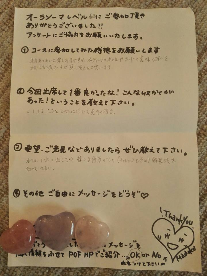 2日目: 2016年3月3(木) 3日目: 2016年3月10(木) 時間:10:00~17:30 ですが、現在、2016年1月以降の日程で さらなるリクエストも受付中です☆ ご予約・問合せ ただ、上記にも書きましたが お申込み&ご入金が来年になりますと 上記日程での受講でも、 費用が新価格となりますので お気をつけ下さい。 お得な割引を利用されたい方は、 今すぐ、こちらからどうぞ! ご予約・問合せ 煽ってるようで申し訳無いですが 年末の慌ただしい中ですので 気になる方は忘れない内に こちらにお申込みしておいてくださいね。 あーー!!年内の特典、気になっていたのに、 来年になっちゃった(T0T)となるのが 一番私もせつないですから。 ダルオさん赤ちゃんに、ビーマー施術するの風景☆ ↓おまけ↓ ↓ビーマーライトペンを実際の生活の中で↓ ↓リアルにお役立て頂くための↓ ↓満登香発案の、さらなるサービス↓ ●POF、ビーマー受講生様だけの オリジナル特典 ご本人とご家族のセルフケアのために 最も必要なバイアルを115種類の中から 選択し、お伝えします。(回数無制限) 具体的に、これから叶えたい夢や 今解決したい悩みを 簡潔に教えて頂ければ 何色のどのペン先を使うと良いかを ご本人様の潜在意識にアクセスし 割だし、お伝えします。 過去の受講生様も、来店時、お声掛け 頂ければ、見させて頂けますのでお気軽に お申し出下さいね♪ ペン先の事を、バイヤルと呼ぶのですが 色んな色があります♪ オーラソーマのボトル100本以上の種類 全てが存在しています。 (基本セットには、14本入っています。) バイヤルはご希望があれば1本、2160円で 増やして行く事も出来ます。 もしこの機会に、ご検討頂けたら